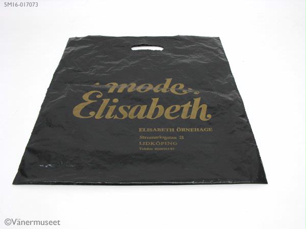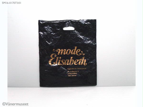 - Plastkasse, svart med text i guldfärg på båda sidorna: Mode Elisabeth, ELISABETH ÖRNEHAGE, Särnmarksgatan 21, LIDKÖPING. Telefon 0510/21385. Utstansat hål för handtag upplill sam är förstärkt. Bälg i botten med text: "Plastpåse utmärkt som förpackning, men farlig som leksak (kvävningsrisk)".