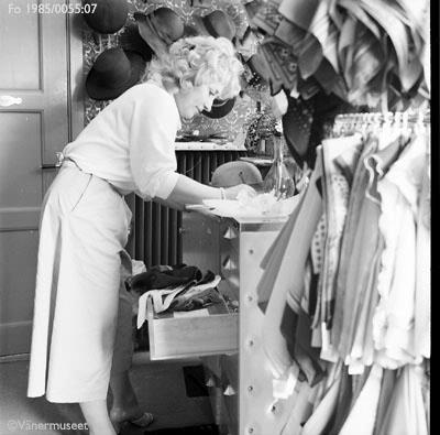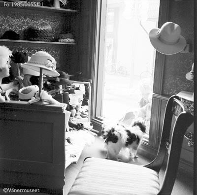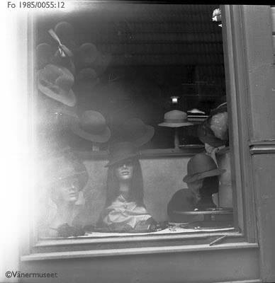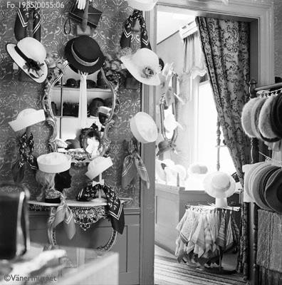 1. Utdragbar skyltlåda i östra fönstret. I skyltlådan finns damhattar och accessoarer som hanskar, väska m.m.