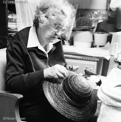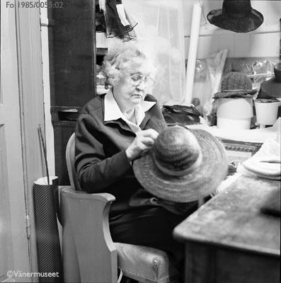2. Modistens mormor sitter och syr flor på en stråhatt, i ateljén.