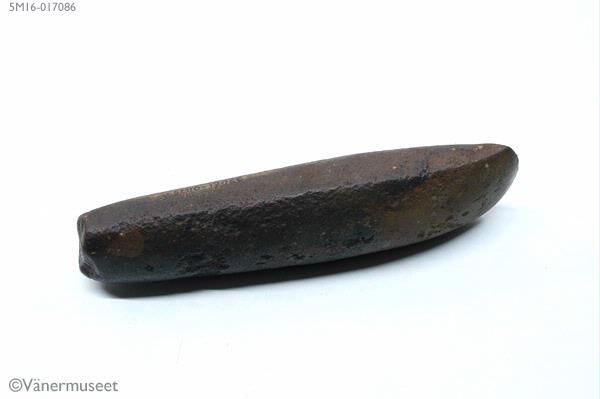Tjocknackig yxa av bergart, rätäggad. Konvex egg, bredsidorna vävlvda, smalsidorna plana, nacken grovt tillhuggen. Helas yxan har varit slipad. Eggpartiets slipning frantröder nu bäst. Genom vattnets påverkan har ytan vittrat något och redskapet har färgats av humussyror. - Katalogtext skriven av Astrid Linder-Nissen, Skaraborgs länsmuseum 8/7 1977.