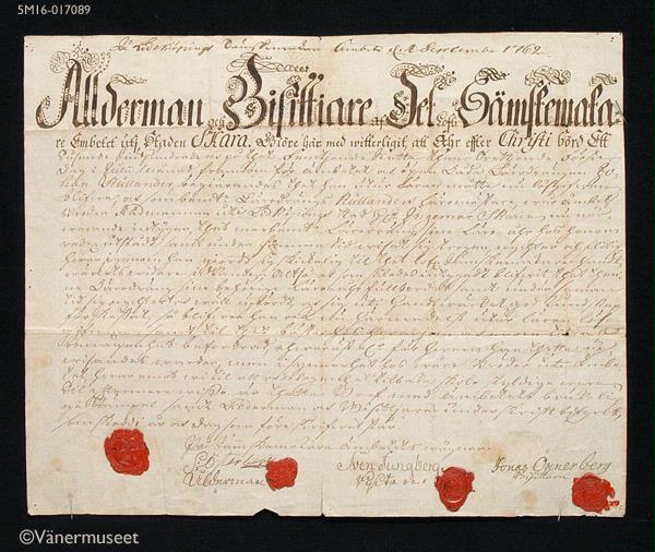 - Gesällbrev för Johan Kullander utfärdat av Sämskmakareämbetet i Skara 1762. Handskrift med svart bläck på handgjort papper. Papperet har varit vikt i 16 delar. Handlingen är undertecknad av åldermannen S.Österberg samt bisittarna Sven Jungberg och Jonas Önnerberg. Fyra röda sigill i underkanten: tre med sämskmakarnas emblem och det längst till höger med initialerna J Ö (Jonas Önnerberg).
