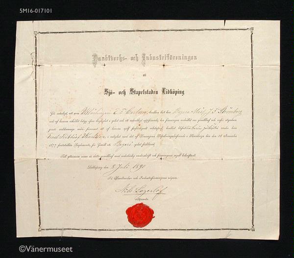 Gesällbrev för Enst Frithiof Carlsson utfärdat av Lidköpings Hantverks- och Industriförening den 8 juli 1890. Formulär tryckt i svart samt handskrift med svart bläck på maskintillverkat papper. Papperet har varit vikt i 15 delar, några hål i de gamla vikningarna. Handlingen är undertecknad av ordförande Nils Lagerlöf. Hantverks och industriföreningen sigill i rött i underkanten, med S:t Nikolai i centrum.
