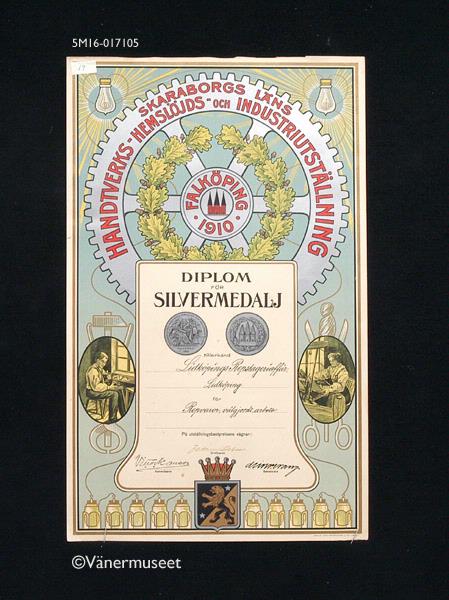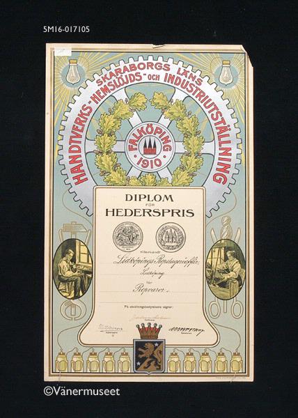Diplom för Lidköpings repslageriaffär vid Skaraborgs Läns Hantverk- Hemslöjds- och Industriutställning i Falköping 1910.