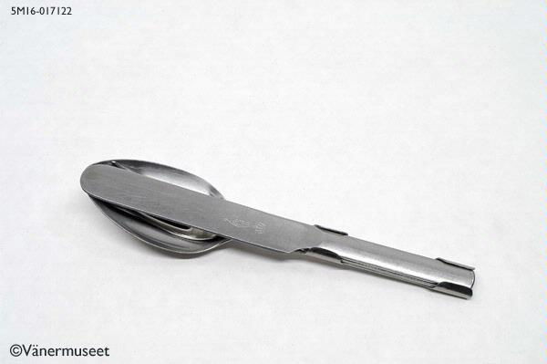 Resebestick i rostfritt stål. Användes också av de som gjorde militärtjänsten. Tre delar: kniv och gaffel som är instuckna i en sked. På kniven texten Mema ROSTFRI samt en krona. PÅ skeden två flänsar som håller gaffel och kviv på plats.