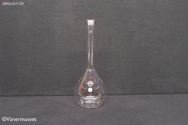Kolv av glas med hög hals och rundad kant, Pyrex, France, 1000 ml. En röd prick är målad på kroppen ovanför firmamärket. På halsen är tryckt ett S omgivet av strålar. Halsen övre del är etsad och på denna är tryckt 19/17 i grönt. Rundad mynning.