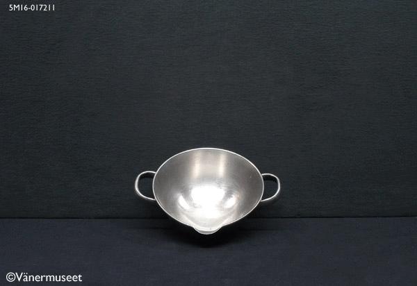 Avdunstningsskål med pip och två handtag. Rund botten. Märke instansat under ovankanten: "OLOFSTRÖM, OB, ROSTFRITT" inom en oval. Under ena handtaget är inristat siffrorna 487.