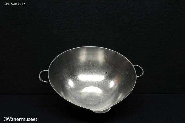Avdunstningsskål med pip och två handtag. Rund botten. Märke instansat under ovankanten: "OLOFSTRÖM, OB, ROSTFRITT" inom en oval. Under ena handtaget är inristar siffrorna 1370.
