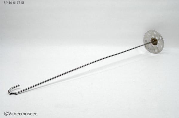 Omrörare till blandkärl, rostfri. Platta med runda hål i konkav form och hantag avslutat med en krok.