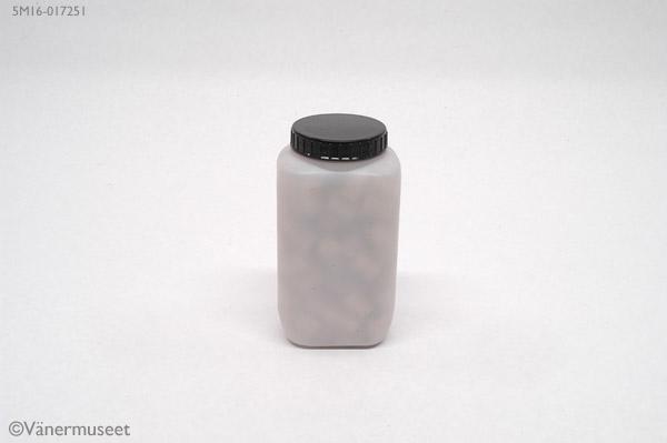 Plastburk, halvgenomskinlig, vit med svart lock. Bruken innehhåller korkar i storleken 20 mm, höga.
