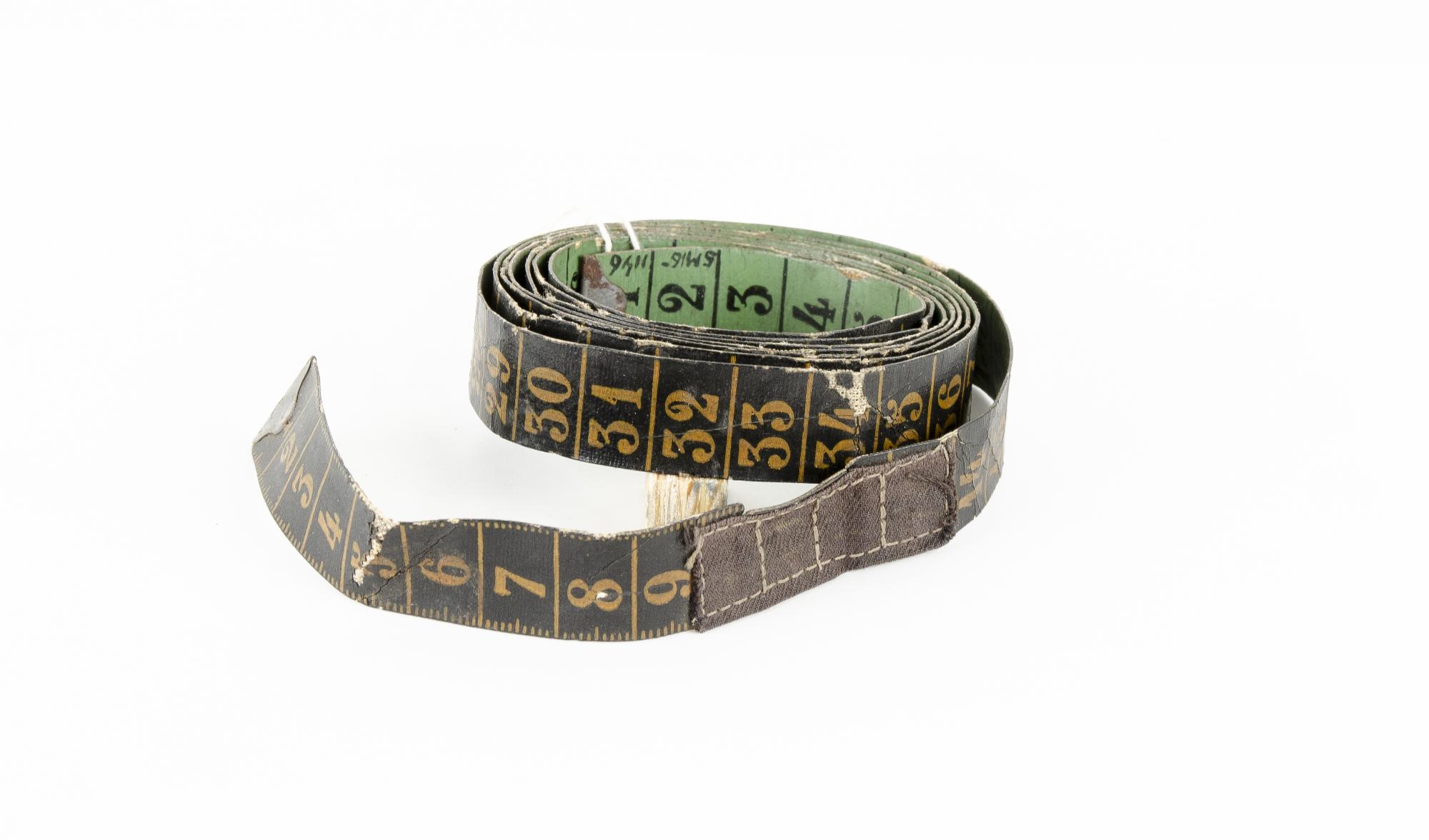 Andra sidan uppmätt i 60 tum, text: GAMLA IMPORT, JC. Ena bandet saknar metallfäste och det anda är löst.