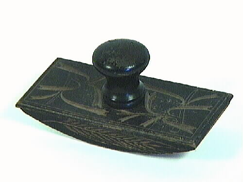 Press för applicering av läskpapper. Svartmålad. Handtaget är svarvat.