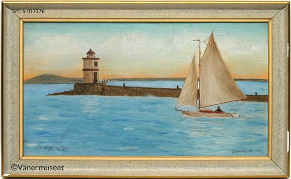 - Oljemålning med titeln "Lidköpings nya fyr" textad nedtill till vänster. Fritidssegelbåt på väg ut ut Lidköpings hamn med piren, fyren och Kinnekulle i fonden. Signerad B. Lidholm 1913, nedtill till höger. Ramad i Falkenberg, enligt stämpel på bakpappen, med profilerad träram i gråmelering ovh guld. Några guldpartier har fallit bort.
