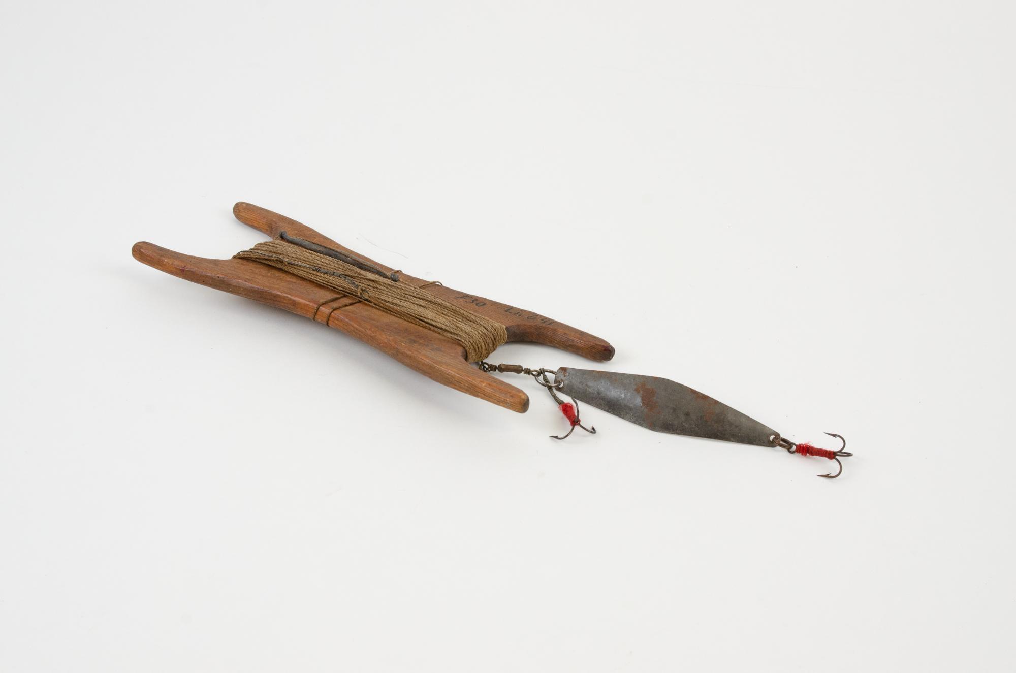 - Revsticka av trä. Avlång med något insvängda sidor. Två korta skalmar i var ände, ca 45 mm långa. Reven lindas upp mellan skalmarna. Gäddrag, utklippt plåtbit med två stycken trekrokar. På reven sitter ett blysänke, i änden finns en tvinnad ståltafs. På stickan står något otydligt skrivet med blyerts, troligen: "Gäddrag, gul... CB".