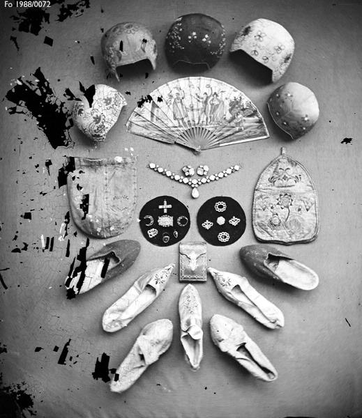 Negativ glasplåt. Uppställning med bindmössor, solfjäder, smycken och damskor fotograferade av Hilder Werner.