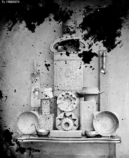 Negativ glasplåt. Uppställning med olika träforemål från allmogemiljö fotograferade av Hilder Werner. Bl a mangelbräde, klappträ, träkärl för dryck och matberedning.