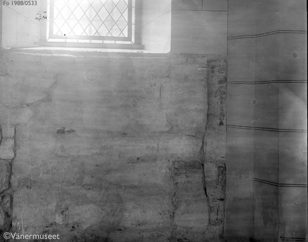 S:t Nicolaikyrkan i Lidköping, interiör. Detalj av muren under södra korfönstret.