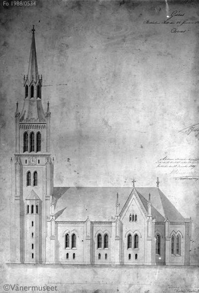 S:t Nicolaikyrkan i Lidköping, ritning fastställd och gillad av konung Oscaar I år 1850. Arkitekt Hjalmar Vinbladh.