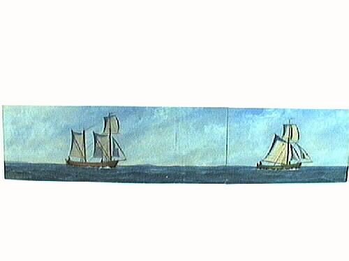 Oljemålning, långsmal. Fartyg till sjöss med hissade segel och besättning på däck. I bakgrunden strandlinje. Ett tvåmastat fartyg och ett enmastat. Båda fartygen är rekonstruktioner av äldre fartygstyper på Vänern gjorda av Benjamin Lidholm. Tavlan använd vid utställning.