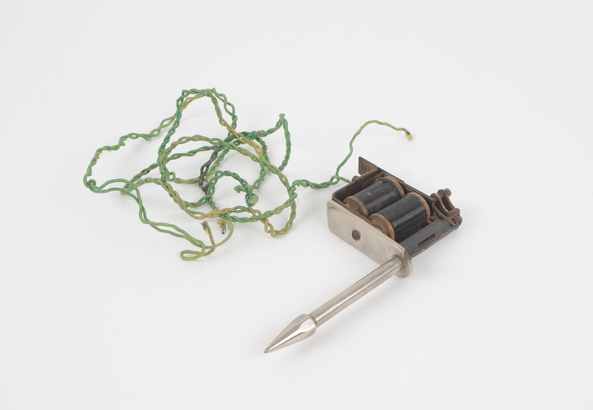 - Tatueringsapparat som genom en sladd (1,40 m lång) ansluts till ett batteri. Två magnetspolar alstrar strömmen vilket medför att en nål går genom en smal cylinder till en behållare för färg. Behållaren är konformad med ett litet hål i spetsen genom vilket nålen kommer ut med färg. Magnetspolarna sitter på en bricka av metall som även håller den smala cylindern. Över spolarna har troligen någon sorts hylsa suttit.