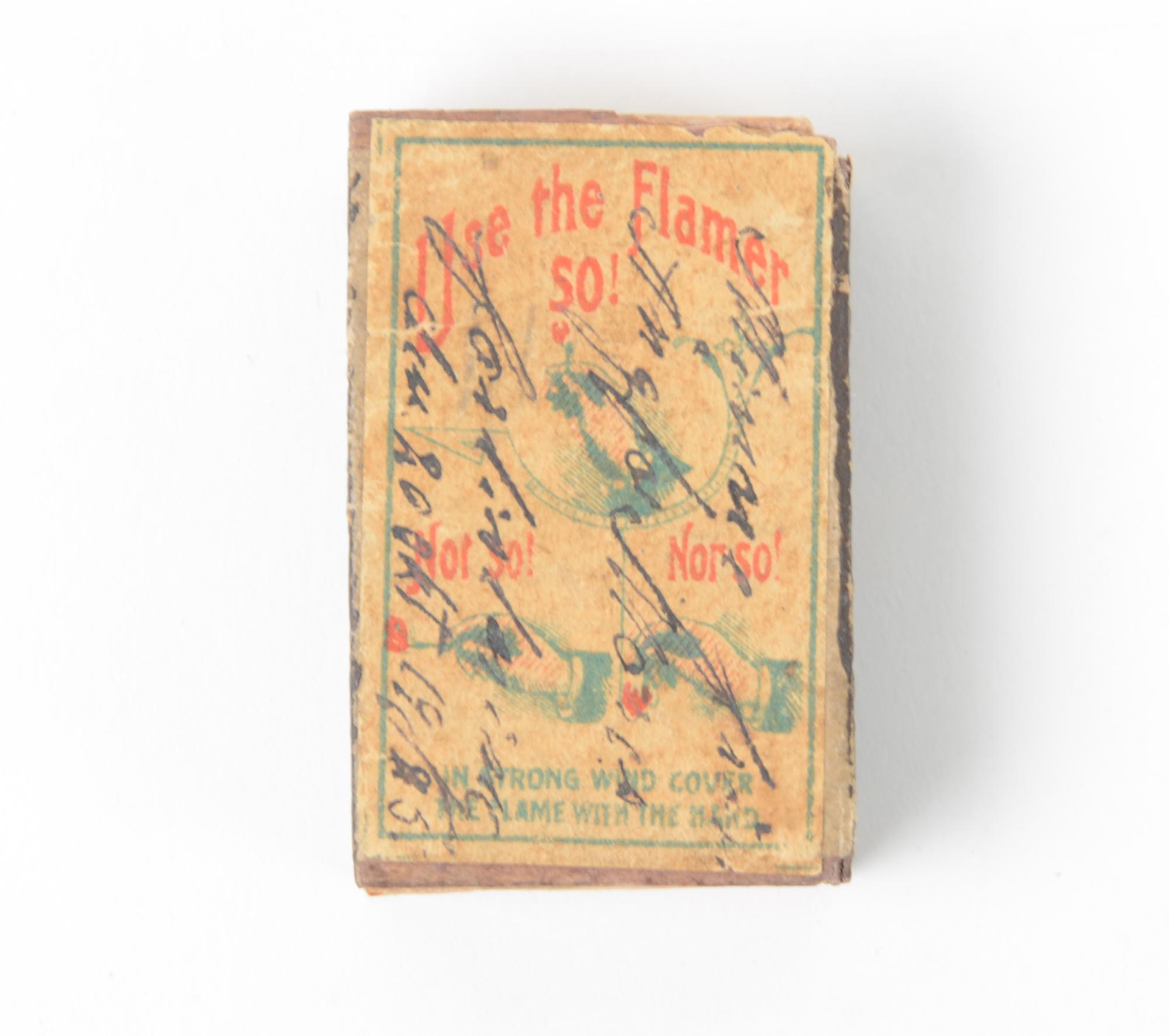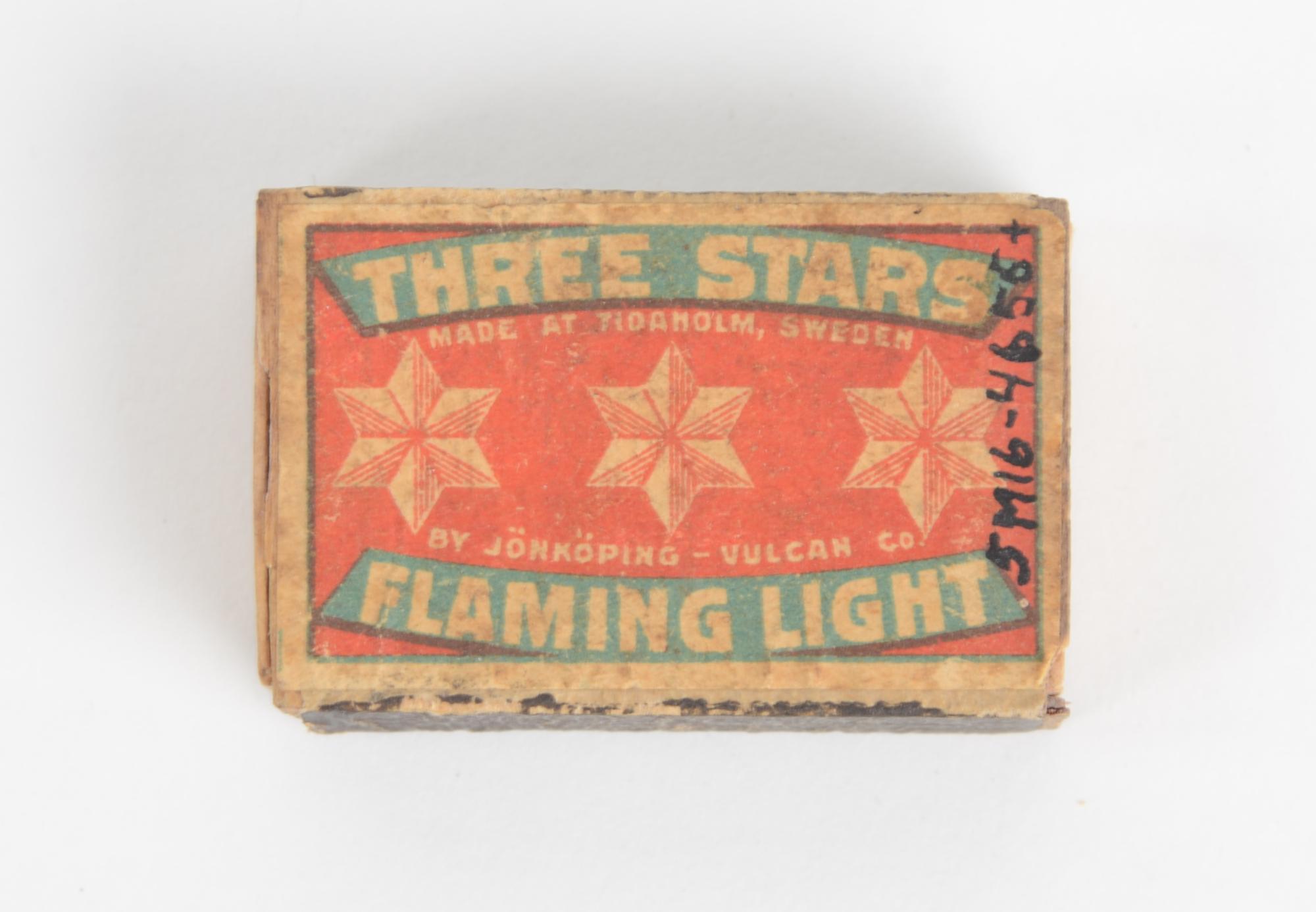 - Tändsticksask med en tändsticka så kallad fyrsticka. Den inre asken är klädd med blåvoilett papper. den yttre asken har svart plån på de smala långkanterna. Kortsidornas kanter är målade violetta. En av långsidorna har en etiektt i rött, grönt, gult med tre stjärnor på rad mot röd botten. I gröna banderoller står texten, "THREE STARS, FLAMING LIGHT". Däremellan står texten, "MADE AT TIDAHOLM, SWEDEN, by JÖNKÖPING-VULCAN CO". På baksidan finns en etikett i gult, rött, grönt med re händer som visar hur man skall hålla tändstickan och följande text, "Use the Flamer so!, Not so!, Not so!, IN STRONG WIND COVER THE FLAME WITH THE HAND". Över detta är skrivet med svart bläck, "Minne från Ångf Nores förlisning den 20 oktober 1925". I asken finns en sticka, fyrsticka. den är i blåfärgat trä, en del ofärgat svavel och ytterst en del rödfärgat svavel. Enligt äldre katalogkort fanns asken i en ilanddriven livbåt vid Kjellstorp i Söne socken. Livbåten tillhörde ångaren "Nore" som förliste utanför Hindens rev den 20 oktober 1925.