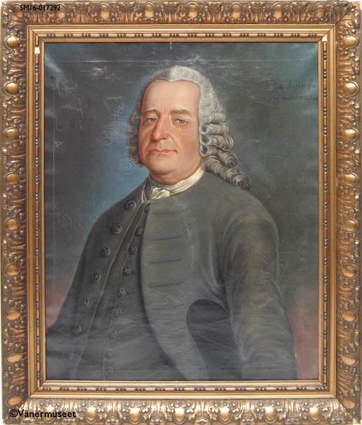 Oljemålning, porträtt av Abraham Lidbeck, född 1699 - död 1776. Abraham Lidbeck är skildrad i gråvit peruk med lockar på sidorna och löst hängande i nacken. Han bär en svagt grå/grön rock utan slag men med knappar och knapphål. Under denna en väst i samma färg samt en vit halsduk. Denna har virats för att sedan knytas runt halsen. Under vänstra armen bär han en trekantig svart hatt. Bakgrunden är grå/blå.