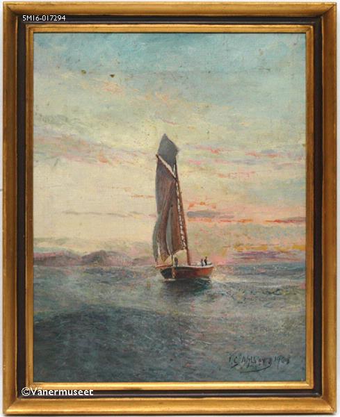 - Oljemålning på duk av Jacob Ahlberg. Marin: enmastat fartyg med hissade segel, sett från aktern, i bildens centrum. Tre antydda figurer i båten. Båten seglar mot en rosa solnedgång. Lungt vatten med dyning. Oljefärgen är mycket torr och ser ut som pastell. Signerad J. G. Ahlberg 1908 i svart, nedtill till höger. Ramad med enkel profilerad guldram med svart parti i mitten.
