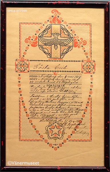 Dopbevis tryckt1912 i blått, rosa och guld, som en mandelformad krans med en duva överst och en stjärna underst. Handskrivet: Gösta Erik, Född i: Lidköping, den 8 nov 1917. Döpt i: Lidköping, den 27 dec 1917 av undertecknad A. G. Fogegård. Föräldrar: Handlanden Erik Tenggren och hans maka Anny Evelina Tenggren i no 51 nya staden Lidköping. Faddrar: Gustaf Einar Palmqvist i no 413 gamla staden, Ingeborg Helena Tenggren i no 88 n.st. Dessutom var vid dopet närvarande farfadern Gustaf Andersson Tenggren i no 88 n.st. och morföräldrarne August Palmqvist med maka Charlotta Kristina Palmqvist i no 413 gamla staden m. fl. Lidköping den 27 dec 1917 A.G. Fogdegård, komminister i Lidköping.