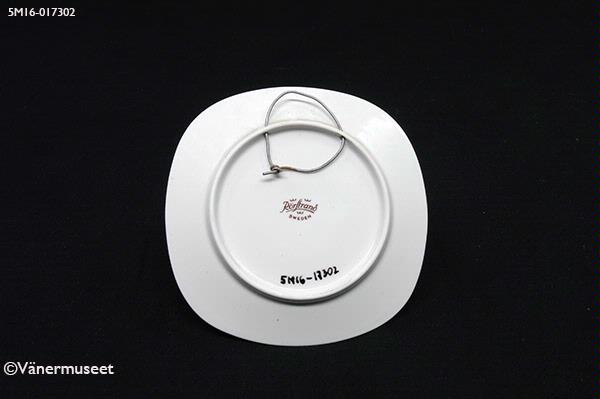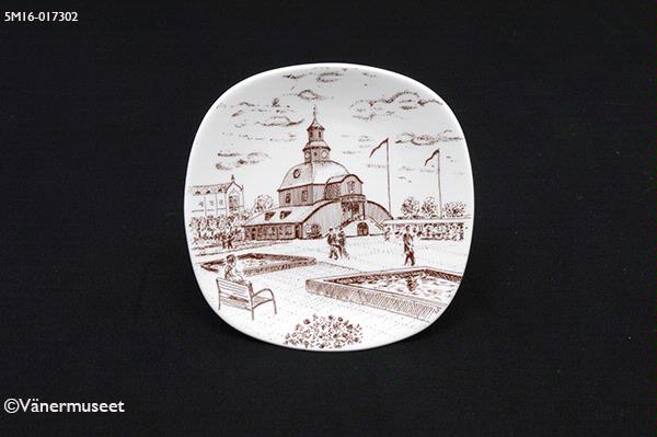 Väggtallrik, kvadratisk, med rundade hörn. Dekor i sepiabrunt, en teckning föreställande en vy över Rådhuset på Nya stadens torg i Lidköping. Tillverkad på Rörstrande porslinsfabrik i Lidköping.
