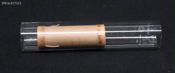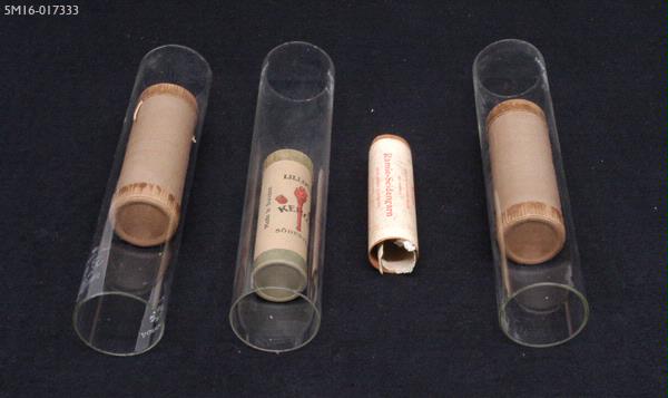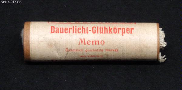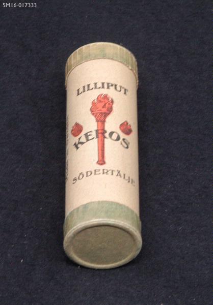 På en av de båda små oblekta pappcylindrarna står texten: LILLIPUT KEROS SÖDERTÄLJE Made in Sweden. Här finns också en teckning av en gaslykta, locken är svagt gröna. Den andra mindre pappcylindern saknar lock, och har en vit etikett klistrad runt hela cylindern med texten: Dauerlicht-Glühkörper, Memo, Gesetzlich geschütze Marke aus edelstem, Ramie=Seidengarn extra schwer imprägniert, Dieser Körper ist ausserordentlich dauerhaft und formbeständig und gibt laut Messung der Reichanstalt andauernd circa 100 Kerzen. Texten omgärdad av teckningar av små gaslampor och underst siffrorna 328.
