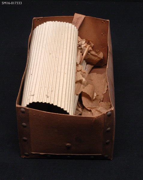 Unikaboxen saknar lock och är deformerad, delarna är hopnitade och har en vävd bomullsrem som låsanordning, ena delen sanas.