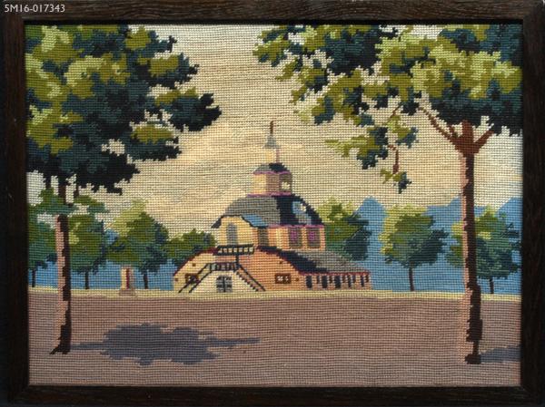Broderi i olika färger. Det gulmålade rådhuset snett framifrån inramad av träd. Sydd med halva korsstygn i början av 1900-talet. Ramad med brun träram, glasad. Ägdes av Brita Lidholm som hade den på väggen i sitt rum på Solhaga äldreboende. Ingrid Karlsson, som arbetade på äldreboendet fick den som gåva 2002. Hon gav den till museet 2014-04-23.