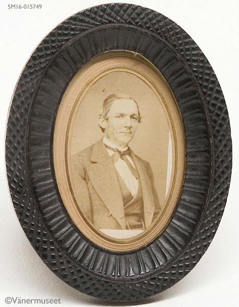 Repslagarmästare Otto Schnidrik, Lidköping. Från 1850-talet. Inglasat i oval svart utskuren träram. Pappen på baksidan är borttagen. Mässingshängare för upphängning. Metallist närmast fotografiet.