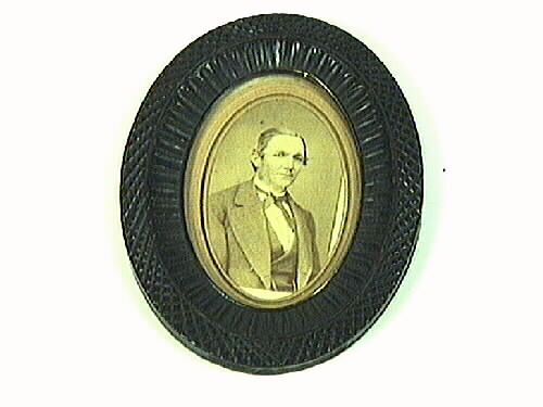 Repslagarmästare Otto Schnidrik, Lidköping. Från 1850-talet. Inglasat i oval svart utskuren träram. Pappen på baksidan är borttagen. Mässingshängare för upphängning. Metallist närmast fotografiet.