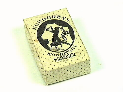 Konfektask för Nordgrens konditori, av papp överklädd med präglat vitt papper. Bild i oval form: Ung kvinna som leker med en kattunge.