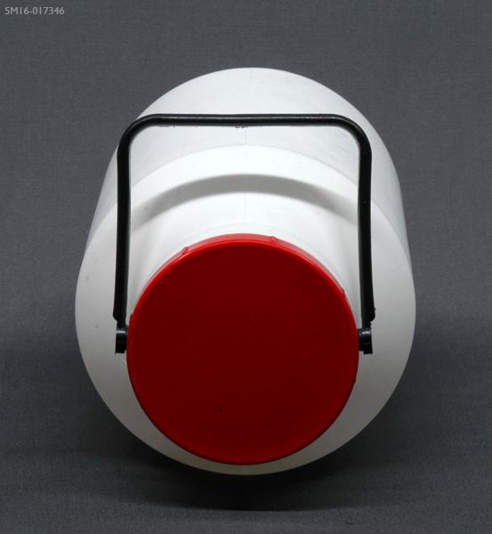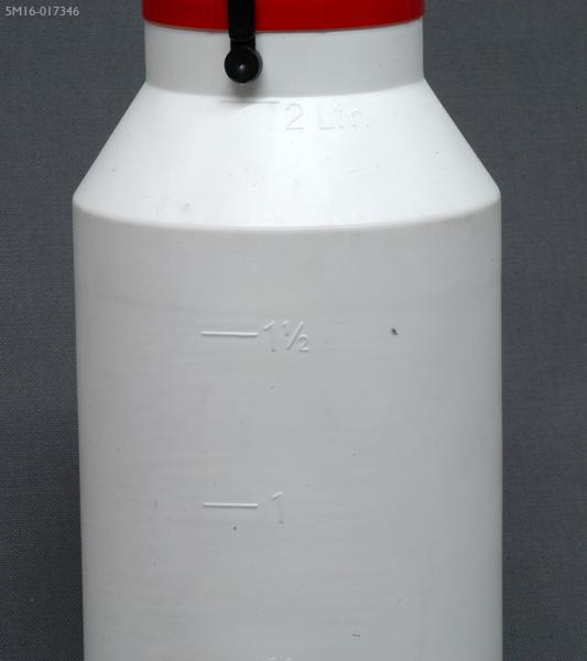 En formblåst cylindrisk flaska av vit plast. Avsmalnande mot öppningen från 170 mms höjd. Tillverkad av polyeten LD (low density), vilket innebär att den är ganska mjuk. Halsen 25 mm hög med gängor. Cylindriskt lock av röd hård formsprutad plast, 10 mm högt, diameter 75 mm. På insidan av locket finns en löstagbar tätning av kork, som är plastad mot flaskans öppning för att täta och skydda korken. Flaskans öppning är 67 mm. Volymen är 2 liter. Flaskan är graderad med streck och siffror bredvid, som reliefer: ½, 1, 1½ och 2 Ltr.