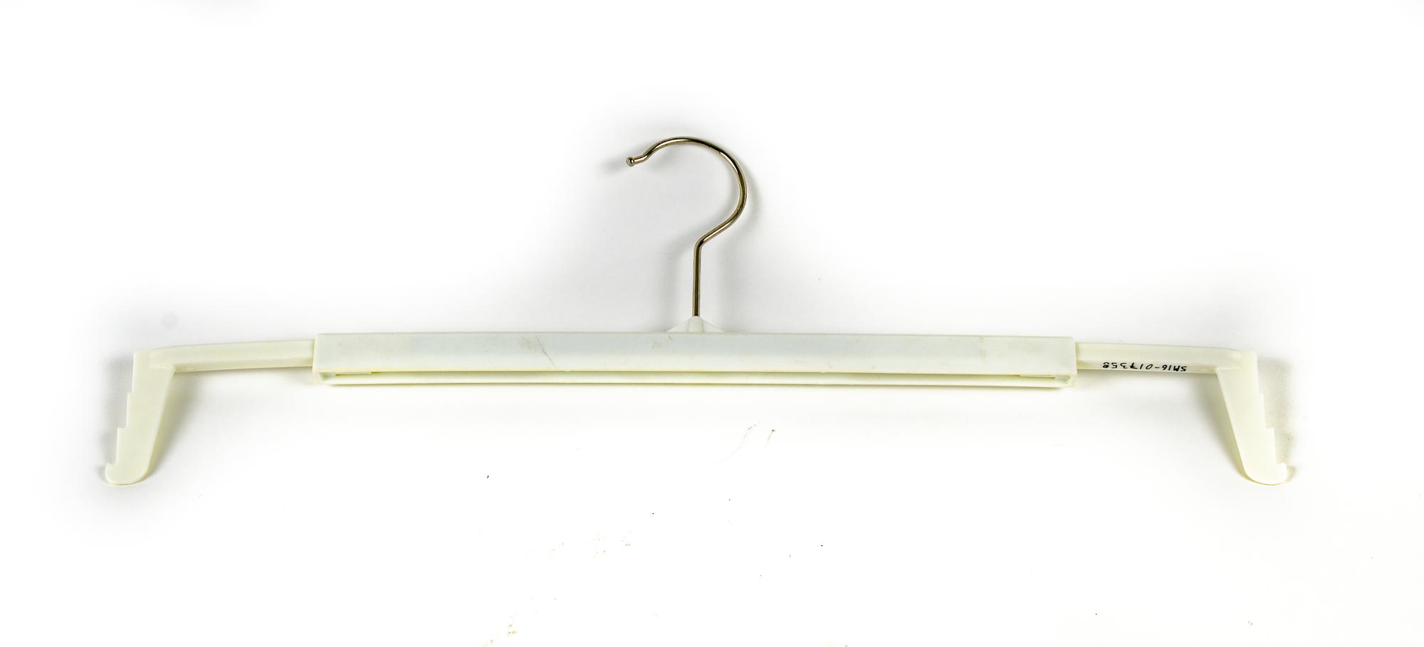 Klädhängare för kjol tillverkad av vit formsprutad polystyren, samt fjädrar i stål. Består av sex delar: två ändstycken, två fjädrar, ett mittstycke och en krok. De båda ändstyckena går att skjuta in genom fjädrarna som är monterade under mittstycket. På undersidan av mittstycket står: 44-48 (storleken), ett P och PAT.PEND., i relief. Modellen fick Karner & Co via köpet av Samuelssons Plast i Falkenberg som hade patent på den. Var komplicerad att tillverka. Tog ca ett år innan allt fungerade som det skulle. Galgen är 111 mm hög från toppen av kroken till mittstycket, höjden är 165 mm från toppen av kroken till ändstyckenas nedre delar, 442 mm bred och har ett djup på 11 mm.