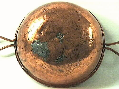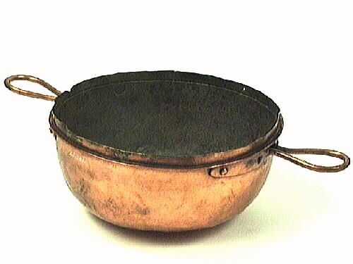 Gryta i koppar, för matberedning, med något rundad botten. Svagt mönster av en sexbladig blomma på undersidan. Två handtag i form av enkla öglor fästa med fyra kopparnitar. Ca 15 mm från överkanten finns ett veck i plåten som bildar en kant, ca 6 mm bred, runt grytan. Under den ena öglan finns en stämpel "SFA". Botten är lagad med lödtenn och kopparbitar.