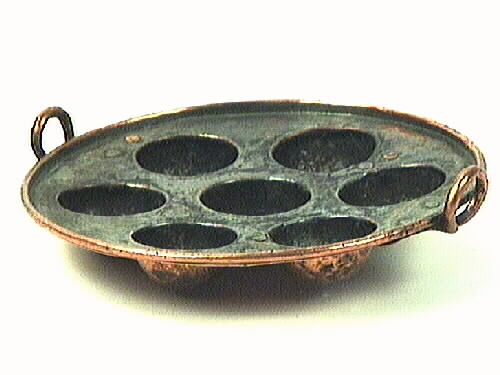 Munkjärn, runt, för sju munkar. Två nitade uppåtstående handtag. Nitar kvar efter trebensfästen. Har tidigare förvarats och varit utställd i ryggåsstugan, som revs år 1950, för att lämna plats till nya läroverksbyggnaden.
