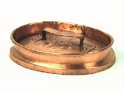 Lock, ovalt, med ca 50 mm hög sida. Stående kant ca 30 mm hög, överkanten slagen runt järnring. Rakt, slutet handtag med rektangulära fästen med avrundade hörn och två kopparnitar. Spår av förtennig i locket.