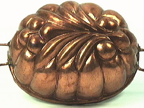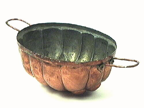 Puddingform. Oval form av koppar. Vegetativt mönster i botten, bladknippe omgivet av frukter, kanterna veckade. Två handtag strax under överkanten, U-formade med två hjärtformade fästen och kopparnitar på varje handtag. Insidan förtent.