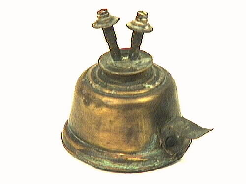 - Gasoljelampa, rund med profilerad underkant, avsmalnande upptill, och profilerat parti. Två hållare till vekar, rester av vekar. På det låga, plana, utåtböjda handtaget står stämplat: "SKULTUNA 1611". Botten är reparerad med lödning runt kanten. På botten finns inristst med stål: "362".