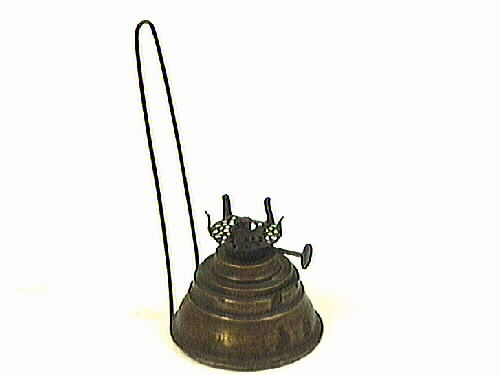 Lampa, med runt lamphus, avsmalnande uppåt i avsatser. Vekhus med hållare för glaskula, vilken fattas. Vid botten en fastlödd järnställning som bildar en smal hög båge för upphängning.