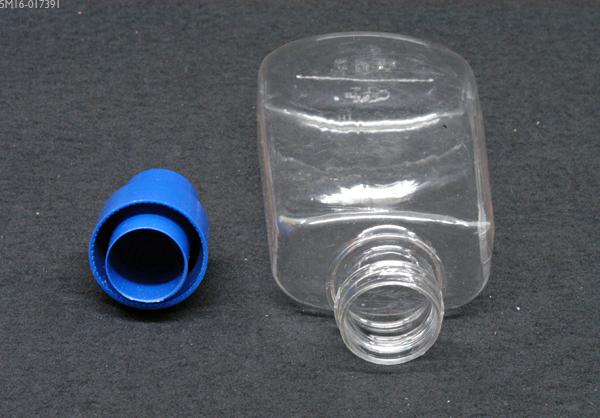 Flask tillverkad av ofärgad PET-plast med blå kork av polyetenplast, av PLM i deras fabrik i Tofta industriområde i Lidköping.