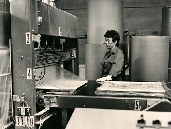 Kerstin Lager vid packningsmaskinen på Lidköpings Värmeledningsindustri, LVI.