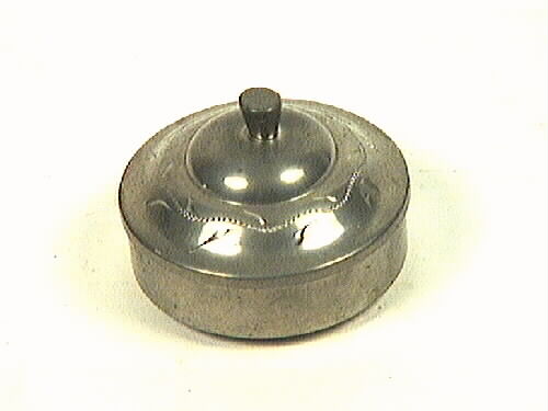 Nipperdosa av tenn med lock. På locket är en stiliserad bladslinga samt en omvänd konisk knopp. I botten finns instämplat ett stadsvapen (Stockholm) samt SVENSKT TENN, en krona omgiven av en ram vari också står FAK, under kronan. Under ramen står årsbeteckningen. I äldre katalog är dosan daterad år 1908.