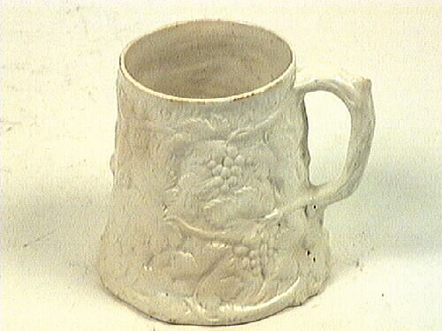 Mugg av lera, vitglaserad, handtag. Vidare nertill och reliefdekorationer på utsidan i form av vinrankor. Delvis oläslig stämpel i botten avslutas med "AH".