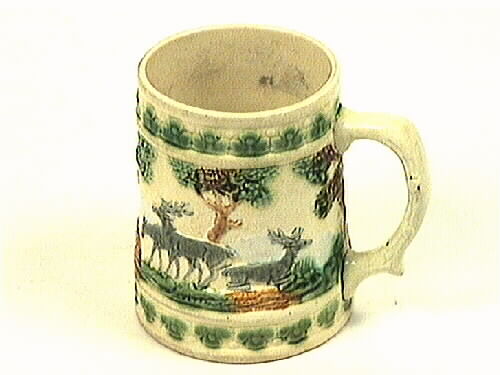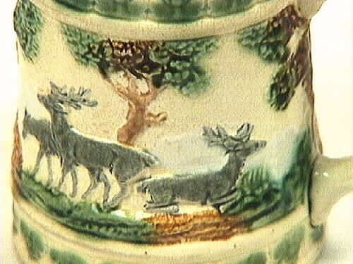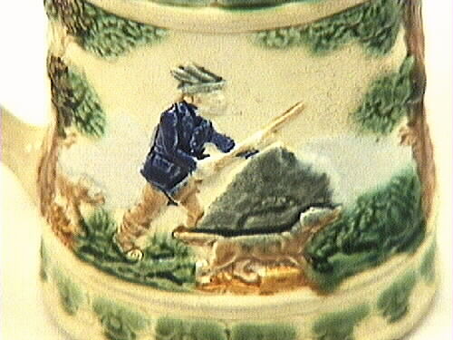 Polykrom fajanssejdel med dekor i form av jaktscen: jägare med två hundar, ett stort träd - "skog" - med tre hjortar. Under och över jaktscenen löper ett grönmålat blommotiv. Dekoren är utförd i svag relief, handmålad i brunt, blått och grått. I botten några blå fläckar samt bokstäverna N och SA samt andra tecken instämplade i godset.