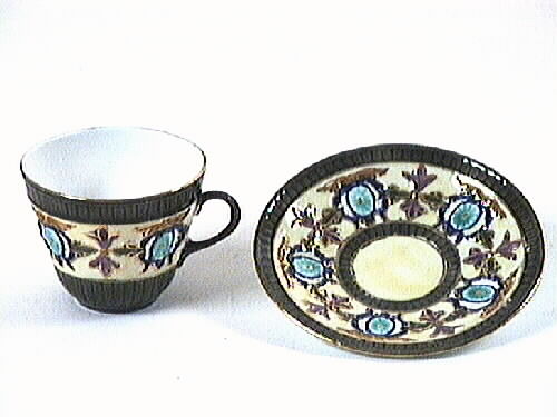 Tekopp med fat. Koppen smal nertill och vidgas uppåt. Dekor på kopp och fat, målad på de delar som har en svag relief. Dekoren liknar medaljonger, kransverk och franska liljor. Grå-gröna band omgärdar dekoren som är blå, grön-turkos, violett, gul och guldfärgad mot en svagt gul botten. Örat brunt.