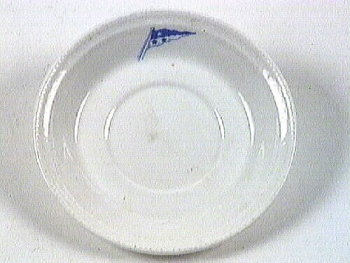 Fat, underdel till kaffegods, som på brämet har en blå och vit flagga med två blå stjärnor på vit botten och en vit stjärna på blå botten. Grundfärg är vit.