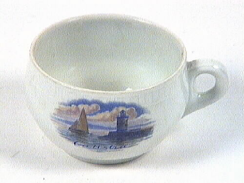 Kopp, vitglaserad kaffekopp. Koppen är utbuktande på mitten avsmalnar sedan något vid mynningen. På koppens kant finns en slinga i rutmönster som är pressad in i flintgodset. En bild på koppen föreställande en båt och en fyr placerad på en pir. Båtens segel är ljusbruna, skrovet är brunt. Fyren är blå och brun liksom piren. I bakgrunden ett berg i blått. På himlen, som skiftar mellan ljust lila till blått, finns två moln som skiftar i lila och gult. Havet speglar båt och fyr. Havets färger är blått, grönt, lila och gult. På havets nedre kant står namnet Calistra.